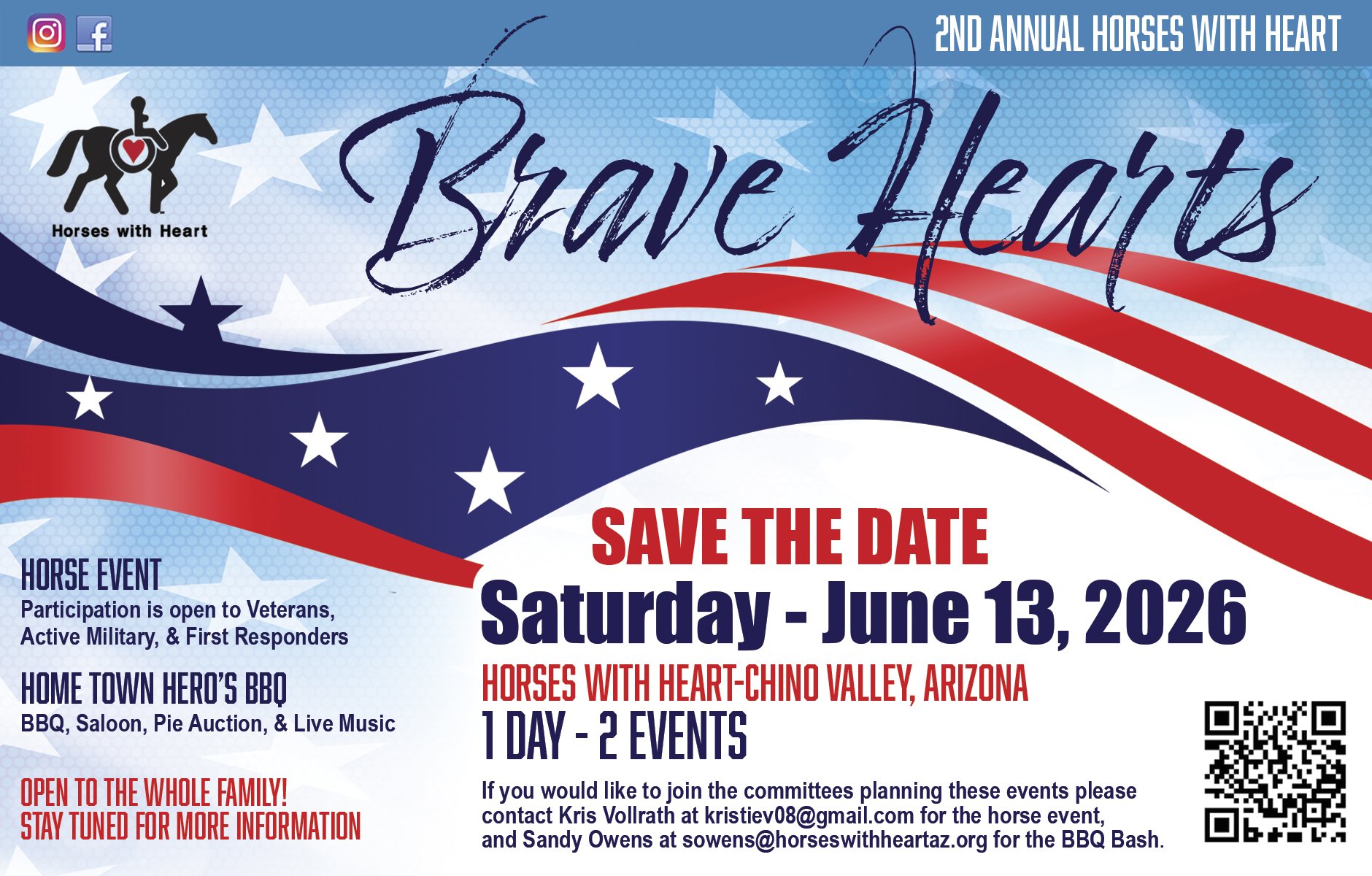 We will be participating in the Prescott Rodeo Parade again this year! Our Entry is entitled “Freedom in Every Stride - Independence through Therapeutic Riding”. The Parade is Saturday, July 4th, and we will need lots of help on the day of the parade and with the planning process. Our next planning meeting is March 14th at 1:00pm in the Horses with Heart office. If you can’t attend the meeting, but would like to get involved please email Sherry Hoover at sherryhwh@gmail.com.